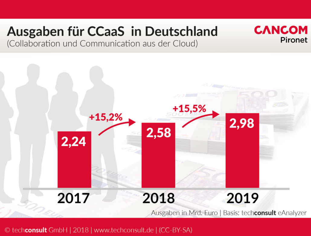 Bis Ende 2019 werden seitens der Anwenderunternehmen jährliche Wachstumsraten von 15 Prozent für Communication- und Collaboration-Lösungen aus der Cloud prognostiziert. Vor allem für schnellwachsende Start-ups und kleinere mittelständische Unternehmen ist es von erheblichem Vorteil, Investitionskosten zu sparen und die eingesparten Ressourcen in anderen Bereichen zu verwenden. 34 Prozent der getätigten Ausgaben für Communication and Collaboration as a Service kommen aus dem Segment der Unternehmen bis 99 Mitarbeiter.