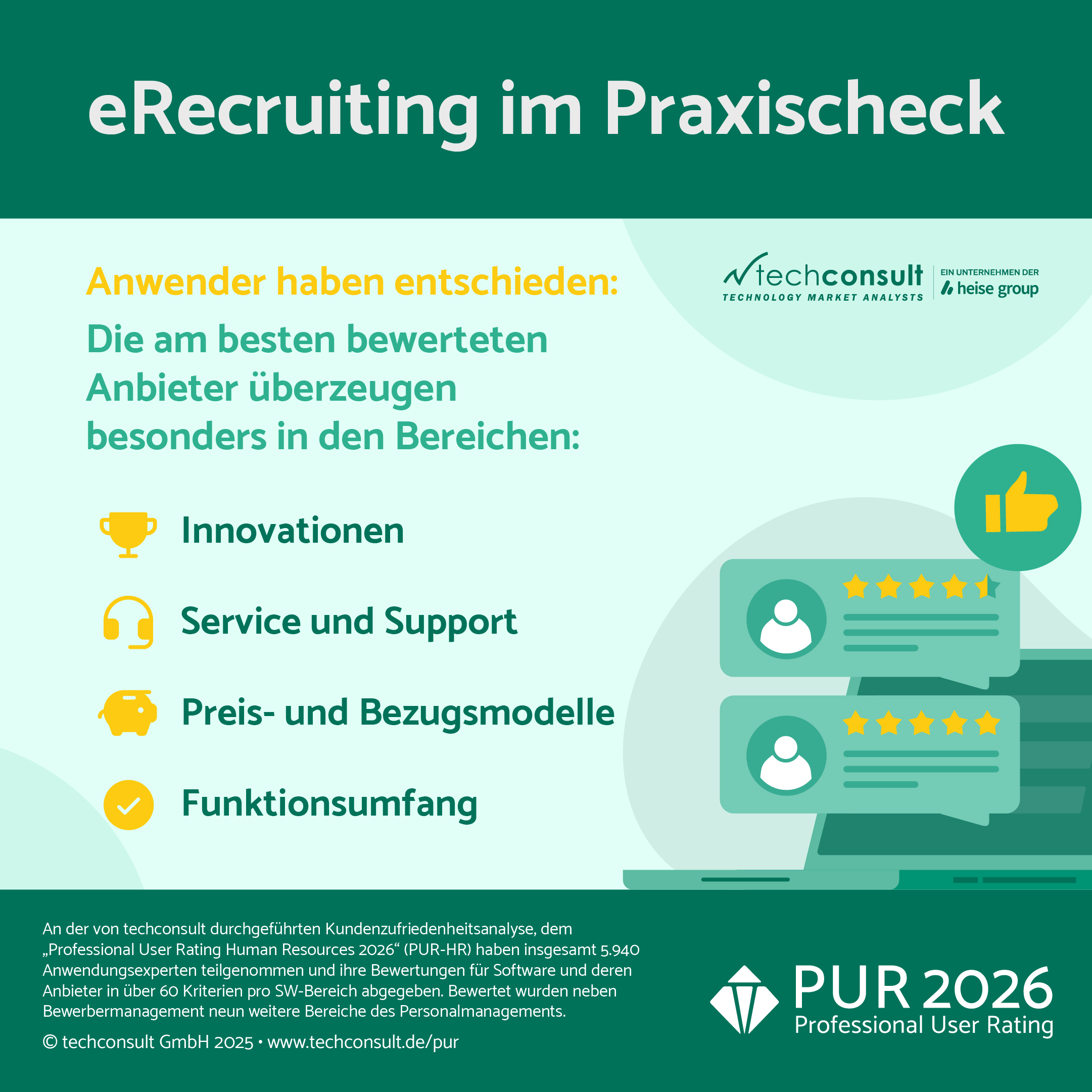 An der von techconsult durchgeführten Kundenzufriedenheitsanalyse, dem „Professional User Rating Human Resources 2026“ (PUR-HR) haben insgesamt 5.940 Anwendungsexperten teilgenommen und ihre Bewertungen für Software und deren Anbieter in über 60 Kriterien pro SW-Bereich abgegeben. Bewertet wurden neben Bewerbermanagement neun weitere Bereiche des Personalmanagements.