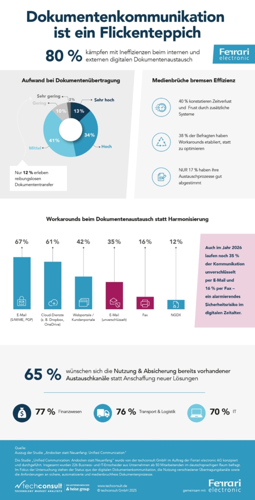 Die Dokumentenkommunikation in vielen befragten Unternehmen ist vielfach funktional, aber selten effizient, simple und nur bedingt sicher. Das ist das zentrale Ergebnis der Studie „Unified Communication: Andocken statt Neuanfang“, die von der techconsult GmbH durchgeführt wurde. Auf Basis von 226 befragten Unternehmen zeigt die Untersuchung deutlich: Medienbrüche, parallele Kanäle und fehlende Ende-zu-Ende-Verschlüsselung bremsen die digitale Transformation.