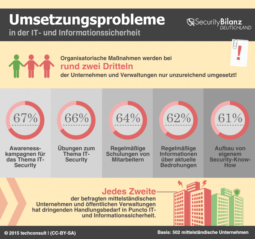 Ein Fazit der Studie Security Bilanz Deutschland ist, dass knapp die Hälfte der befragten mittelständischen Unternehmen und öffentlichen Verwaltungen dringenden Handlungs-bedarf in Puncto IT- und Informationssicherheit aufweisen – zumal sich die Situation seit der Ersterhebung Anfang 2014 verschlechtert hat. Aus diesem Anlass hat das Marktforschungs- und Beratungshaus techconsult ein Strategiepapier erstellt, das Mittelstand und Behörden Hilfestellung dabei bieten soll, die IT- und Informationssicherheit langfristig zu verbessern. Es beschreibt fünf strategische Schritte, die den Anstoß für IT- und Informationssicherheit als Prozess im Unternehmen geben und erklärt, wie sich dieser mittels Standortbestimmung, Informations- und Partnersuche, Budgetplanung und umfassender Perspektive zu einem Kreislauf schließt.